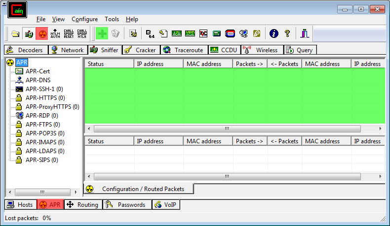 After opening Cain, go to the Tab 'Sniffer' and click on the symbol next to the nuclear icon.